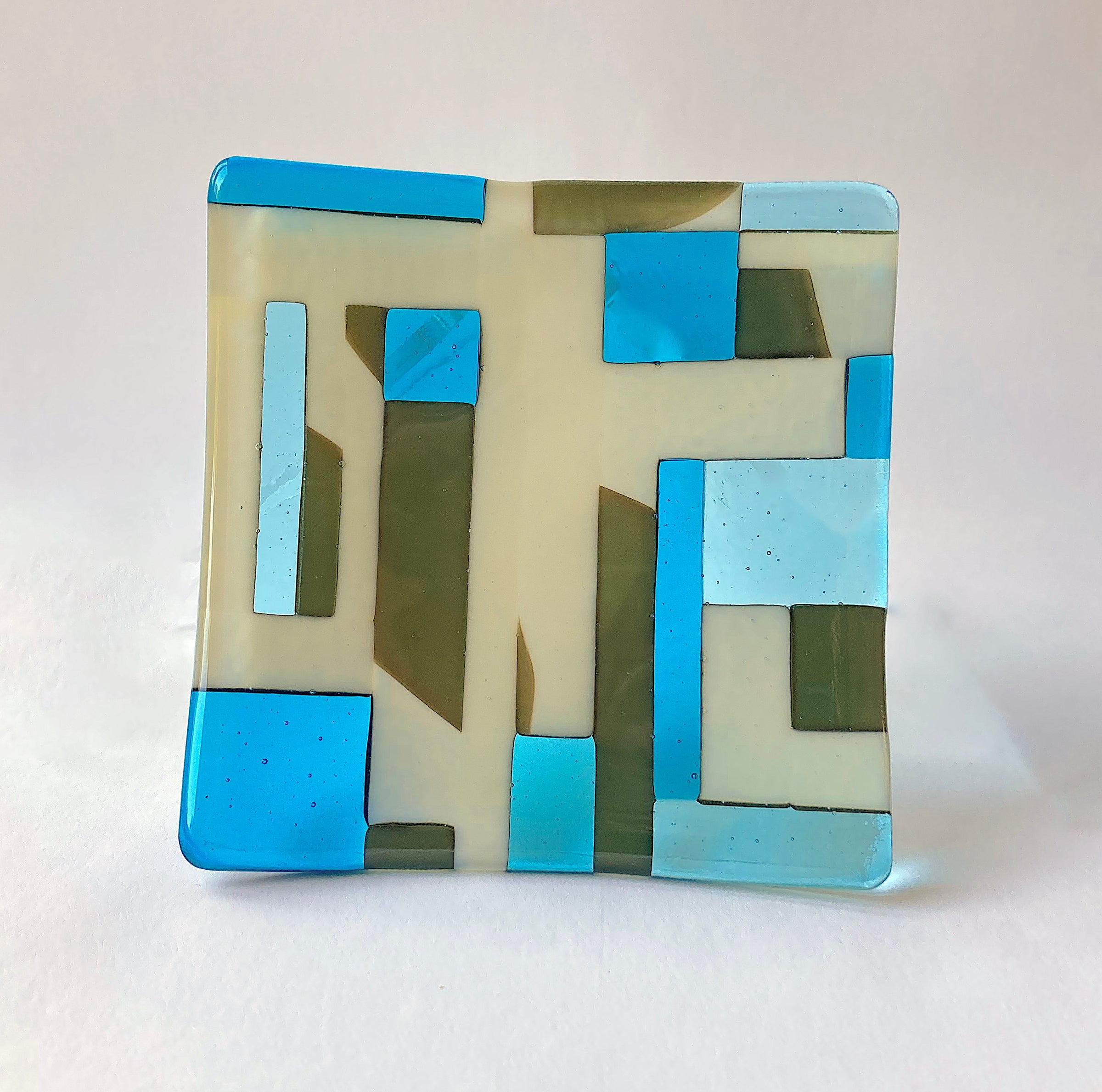 This food-safe little cutie is made with scraps from other projects so nothing ever goes to waste! The vanilla and turquoise colors react where they touch to yield yet other subtle coppery/brown/green tints. The transparent areas add interest as light shines through. Use it to hold or serve anything. See care & use notes on the Art & Entertaining main page.