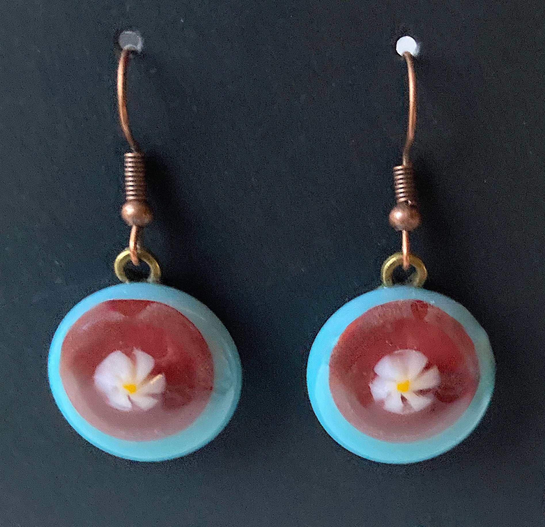 These round fused glass earrings sport a daisy-like flower on a pink and aqua background. They have nickel-free copper colored bails and wires.