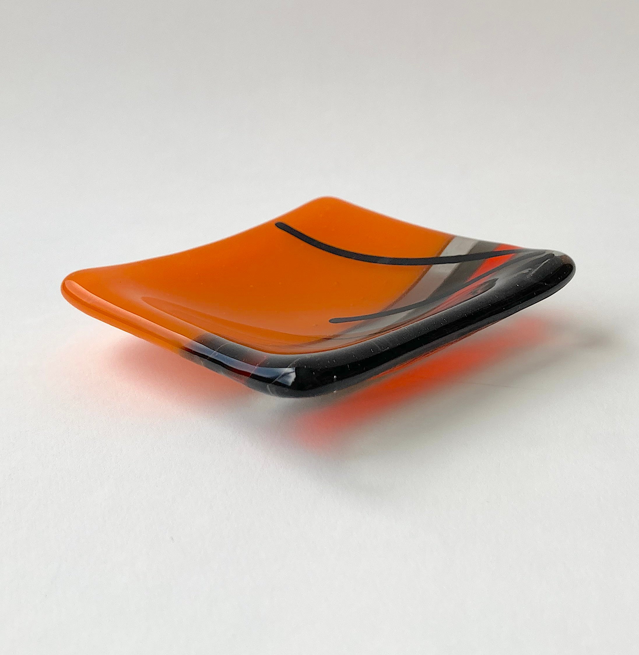 This cute little food-safe fused glass dish is vibrant orange with accents of black and transparent gray stripes.