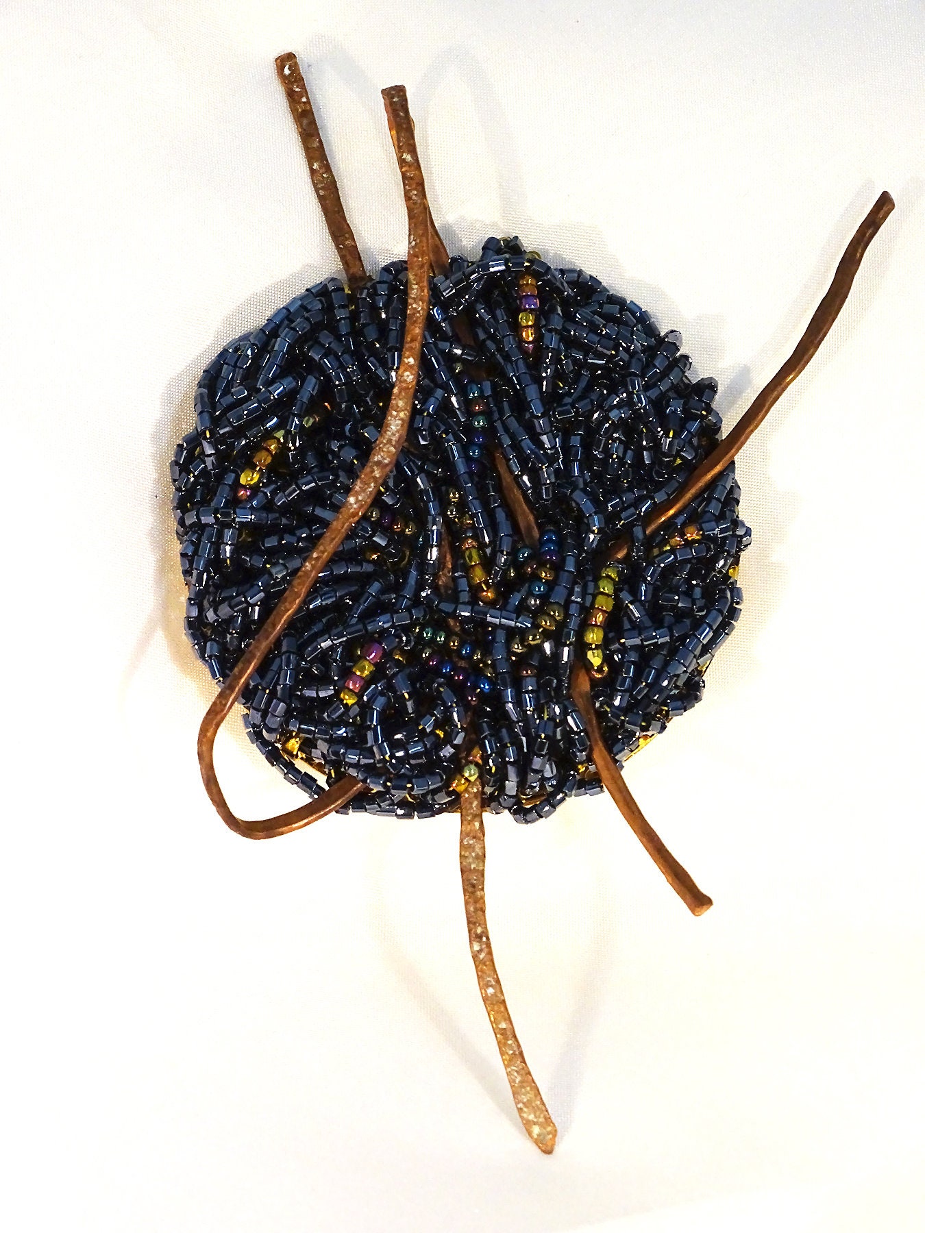 Interesting, contemporary look, caged pin with copper accents. Sparkly black and bronzed colored glass beads and hammered copper wire…what a combo! The finding is vintage brass with a pin on the back: too heavy for lightweight fabrics at 1.5 ounces and measuring 3 1/2 x 5 x 1″. The pin on the back is sharp, so please don’t let children play with the piece.