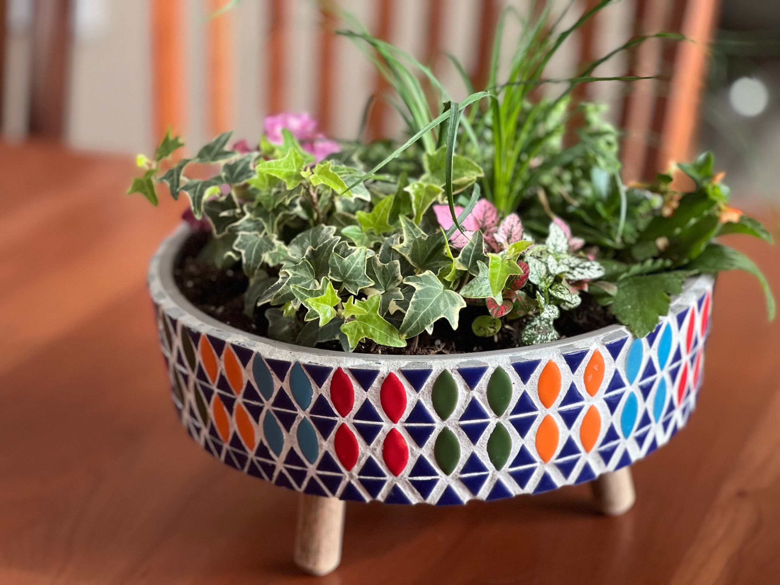 CottageCore fans will love this mosaic indoor planter and its bright pops of color. Cozy home decor is about slowing down and creating gentle moments. Your beloved plant hobby deserves a stunning home! Plant lovers gifts are easy with this 3-legged indoor plant pot using ceramic tiles. Detailed design includes triangles of navy, royal blue, or deep black. The planter does not include the plants shown; that’s meant to spark your ideas for how you’ll use your new favorite planter!