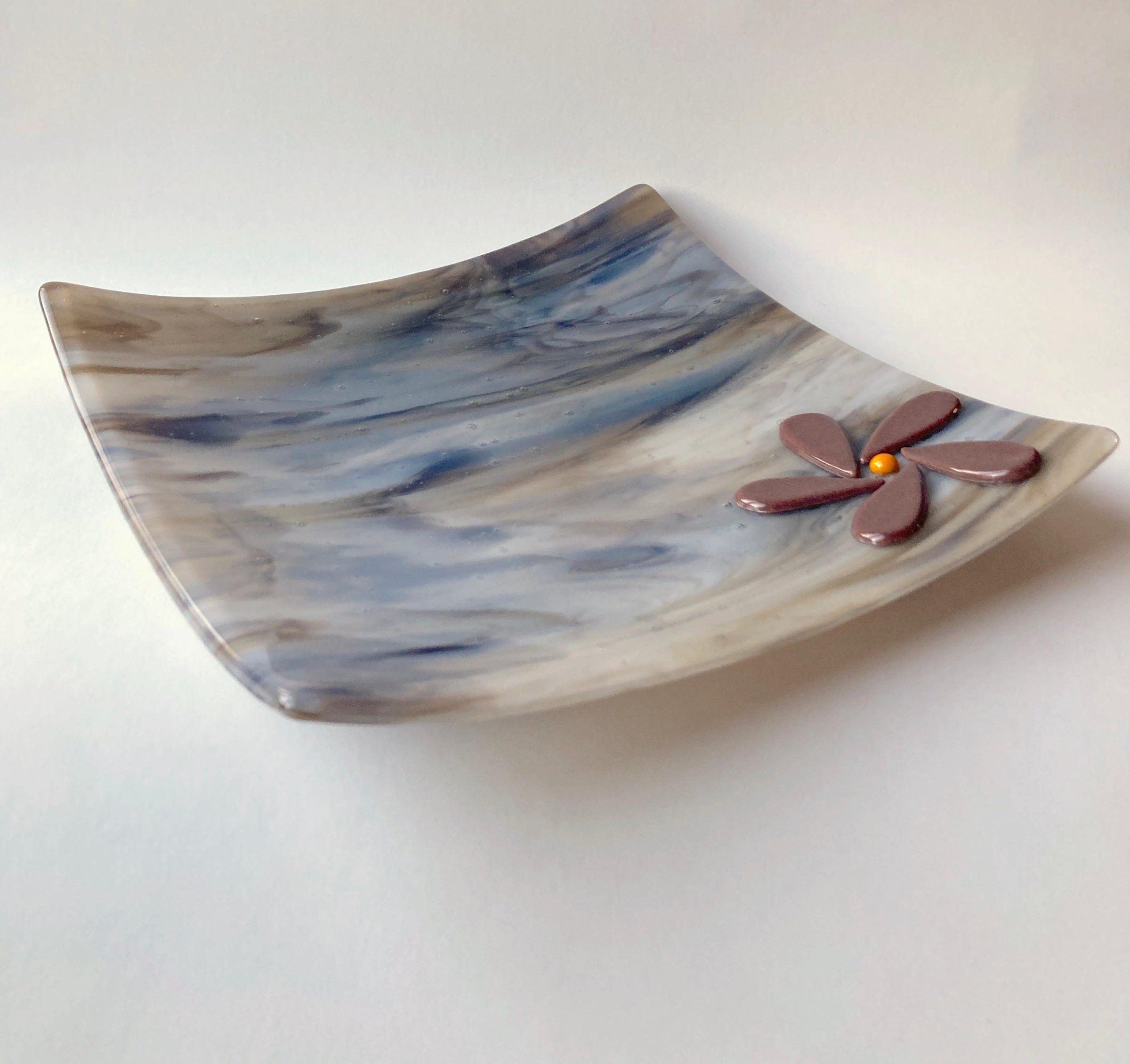 This soothing food safe fused glass large square platter is made from a white & brown streaky glass accented by earthy flower petals. The petals are formed from glass powder recycled from other projects. See care & use notes on the Art & Entertaining main page.