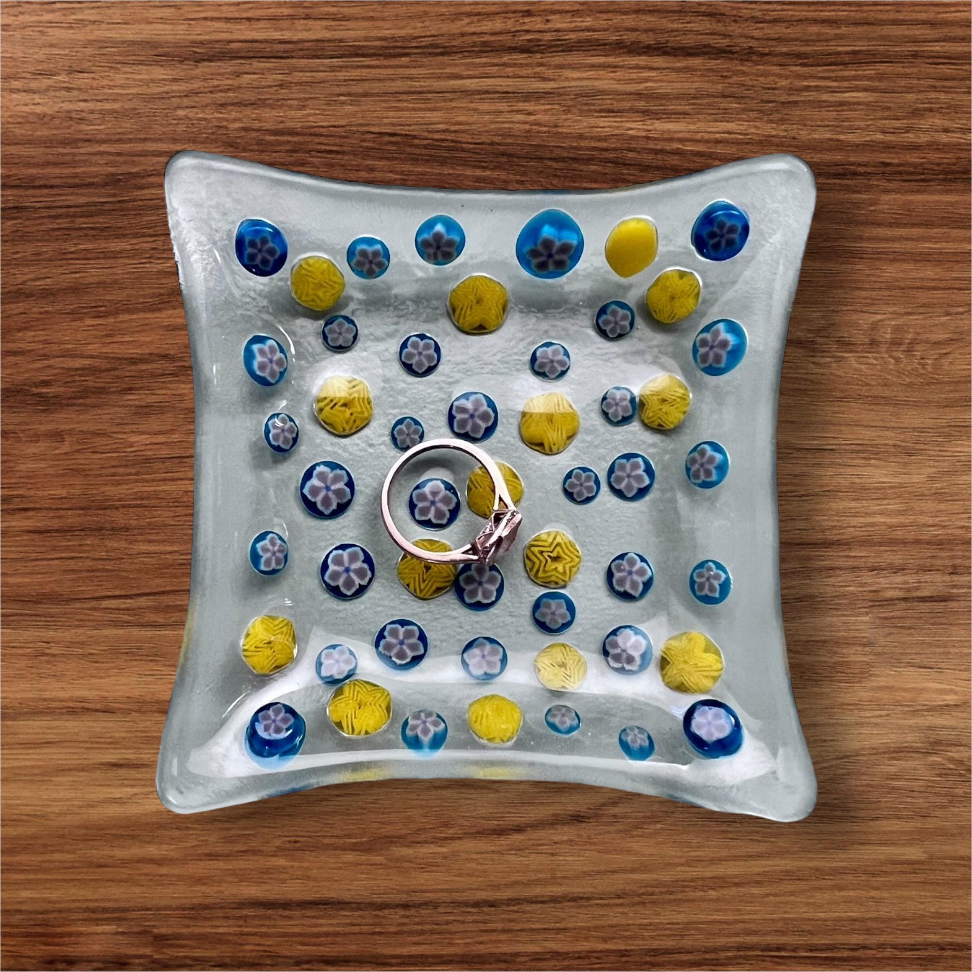 Handmade jewelry dish made from fused glass is the perfect decoration for your bathroom vanity or lovely dresser. No two are alike and this shimmery trinket dish has pops of blue and yellow flowers. Use this artisan-made dish for various things; a hostess gift, keys in your foyer, pocket change, earbuds, or lovely rings. How about gifting this to your favorite tea lover; perfect for their tea bag and sweet treat! A great gift for that special lady who has everything and likes beautiful and unique presents.