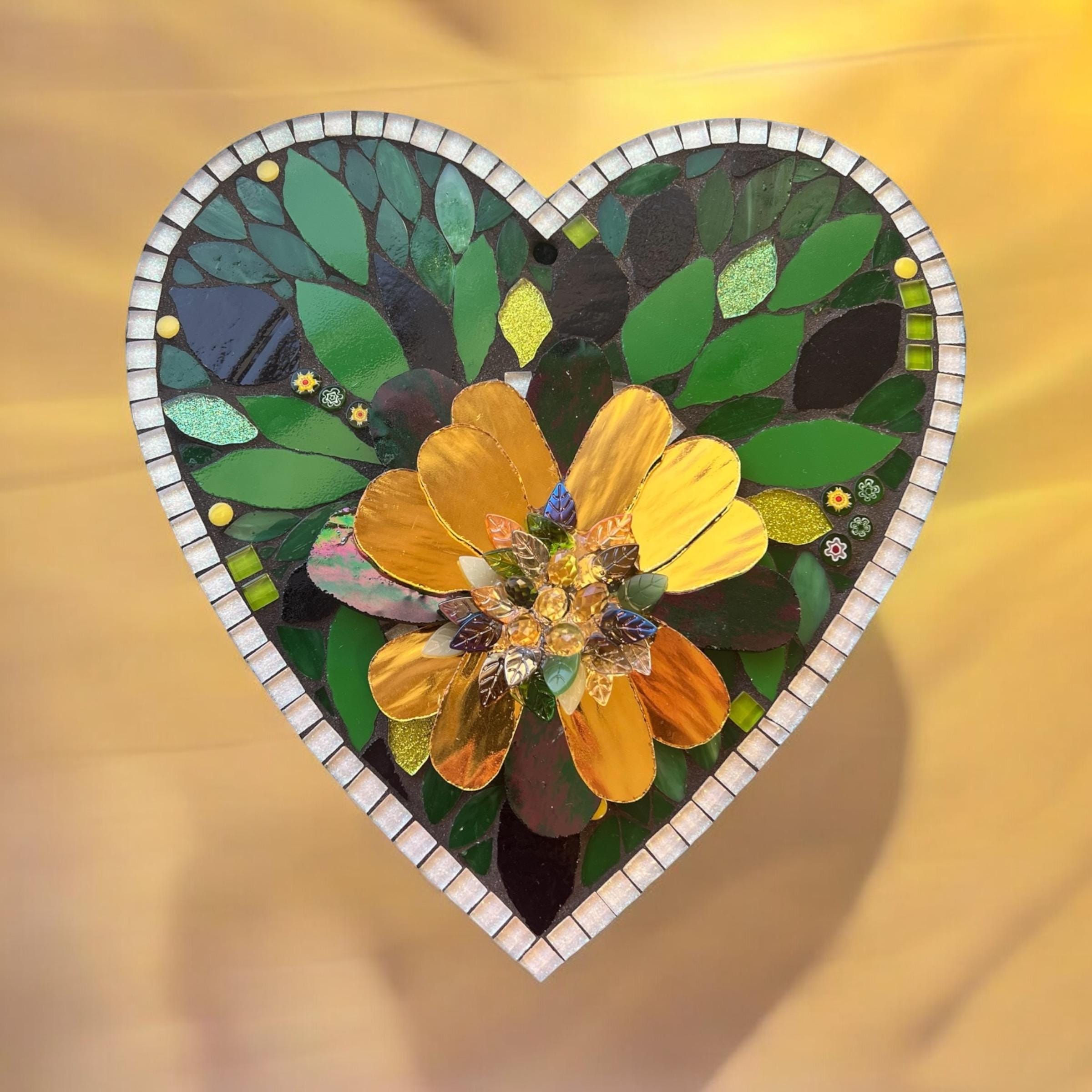 Fused Glass and Tile Mosaic Heart | 3D Flower | Wall Art | Gift for Her | Wall Decor | Home Decor | Wall Hanging | Flower | Anniversary Gift