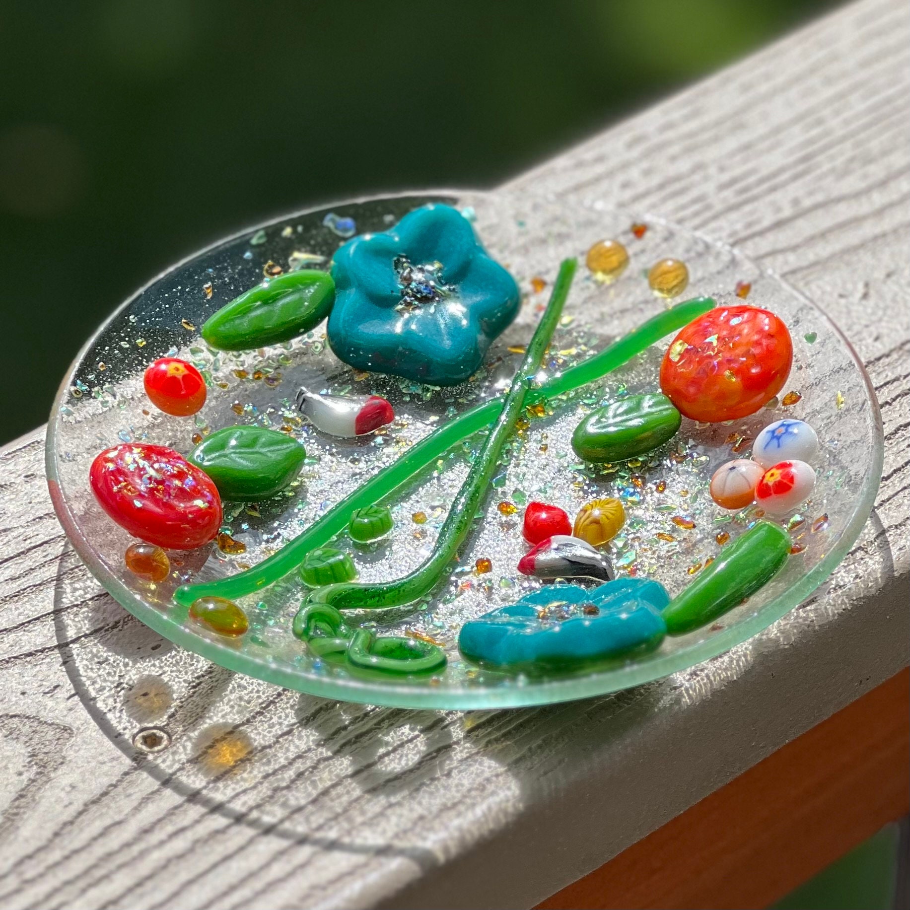 This is an example of something I made in the past. I work with glass, ceramics, and mosaics. Visit my shop on Etsy to see what is current: https://www.etsy.com/shop/nestleandsoarstudio/