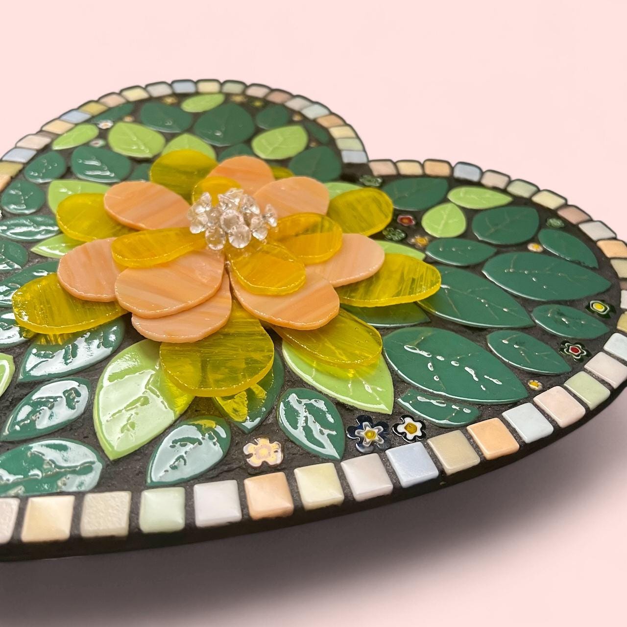New in the studio! Our Wall Flowers Mosaics sparkle as home decor! This one-of-a-kind home decor wall art includes a 3-D flower made of Yellow and Peach glass. Each green leaf in the background is textured ceramic tile. I’ve included the glitter of Italian flower glass beads. The edge of this heart is made of pastel Italian tiles.