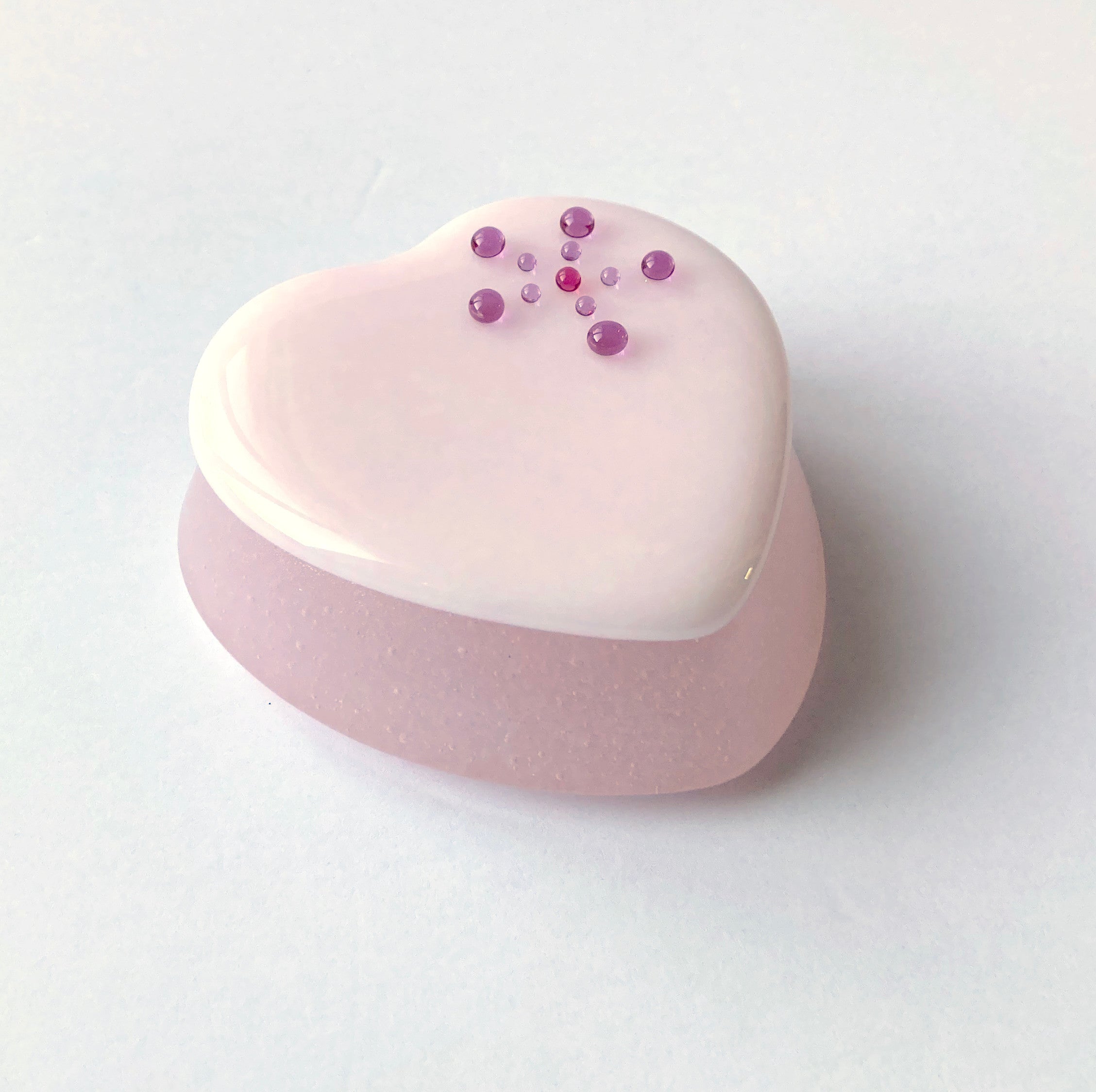 This special little fused glass box takes storage to the next level. Perfect for jewelry, small items, wrapped candies, even pills. It can also be a very special packaging option for a very special gift (hint, hint, those planning a proposal). The base is a translucent pink with a heart shaped compartment. The lid is a pale pink & white mix accented by a star of pink transparent dots. Comes with silicone bumper feet.