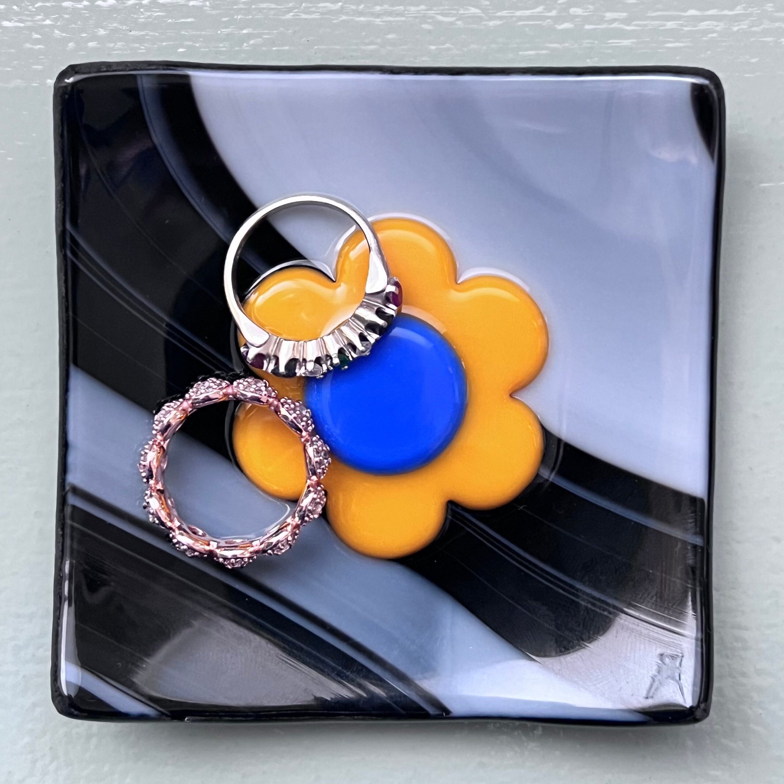 Jewelry Dish | Black and White Flower | Fused Glass Dish | Colorful Home Decor | Gift for Her | Housewarming Gift | Unique | Bridal Gift
