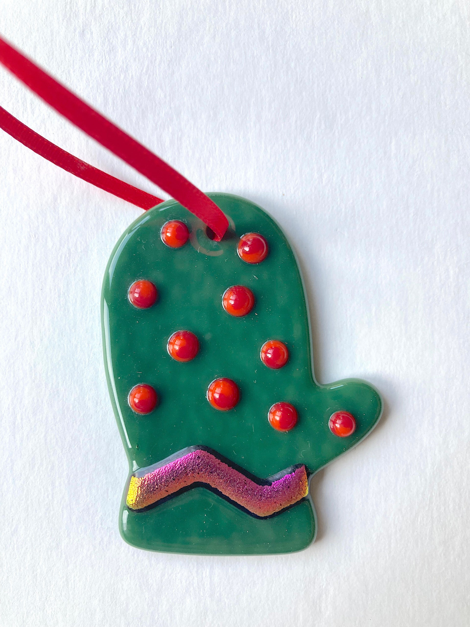 This darling fused glass green mitten with red dots will warm your heart and your tree!