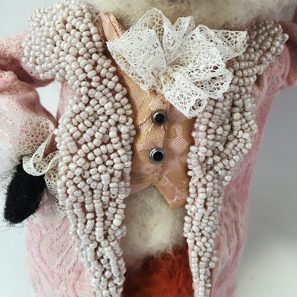 The fancy fox is 10.5″ tall x 3″ wide (27cm tall x 8cm wide); he is needle felted from wool and he has glass eyes and a waxed nose. The jacket is sewn from pink brocade and the lapels are beaded, the vest buttons are vintage sapphire watch knobs and the lace is handmade from Portugal. His arms and legs are adjustable so you can pose him. The fancy fox is quite the dapper gentleman!