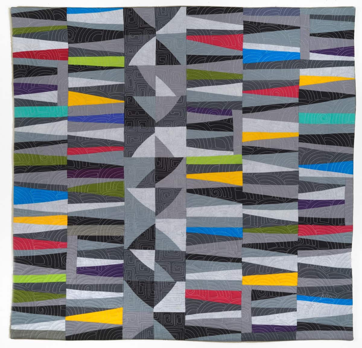 Partly Sunny is an original wall hanging quilt exploring color and value using angled stripes and improv curves–four different gray values provide the base for bright colors to pop.