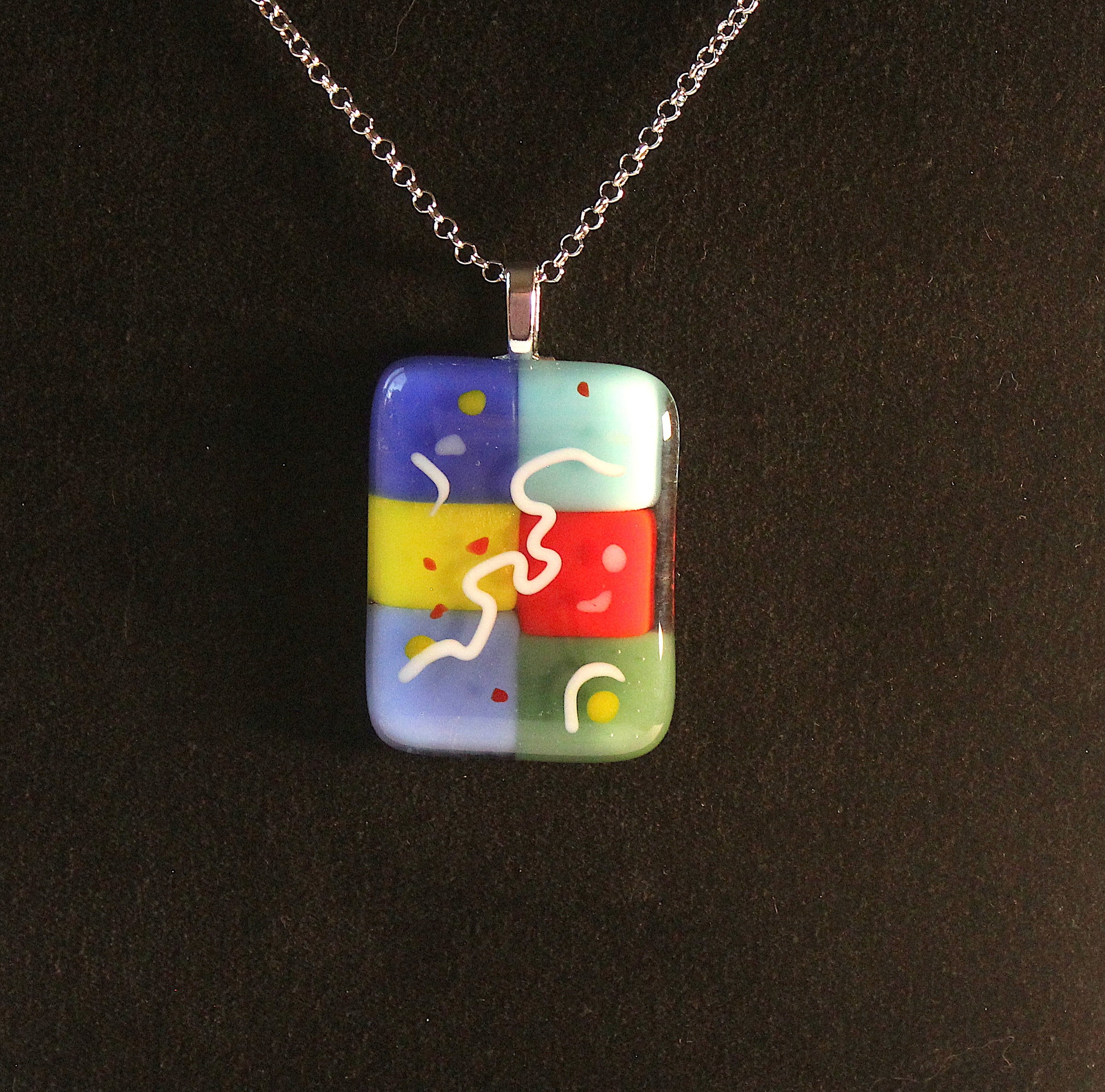 This rectangular fused glass pendant has fun, primary color patches accented with squiggles and dots.