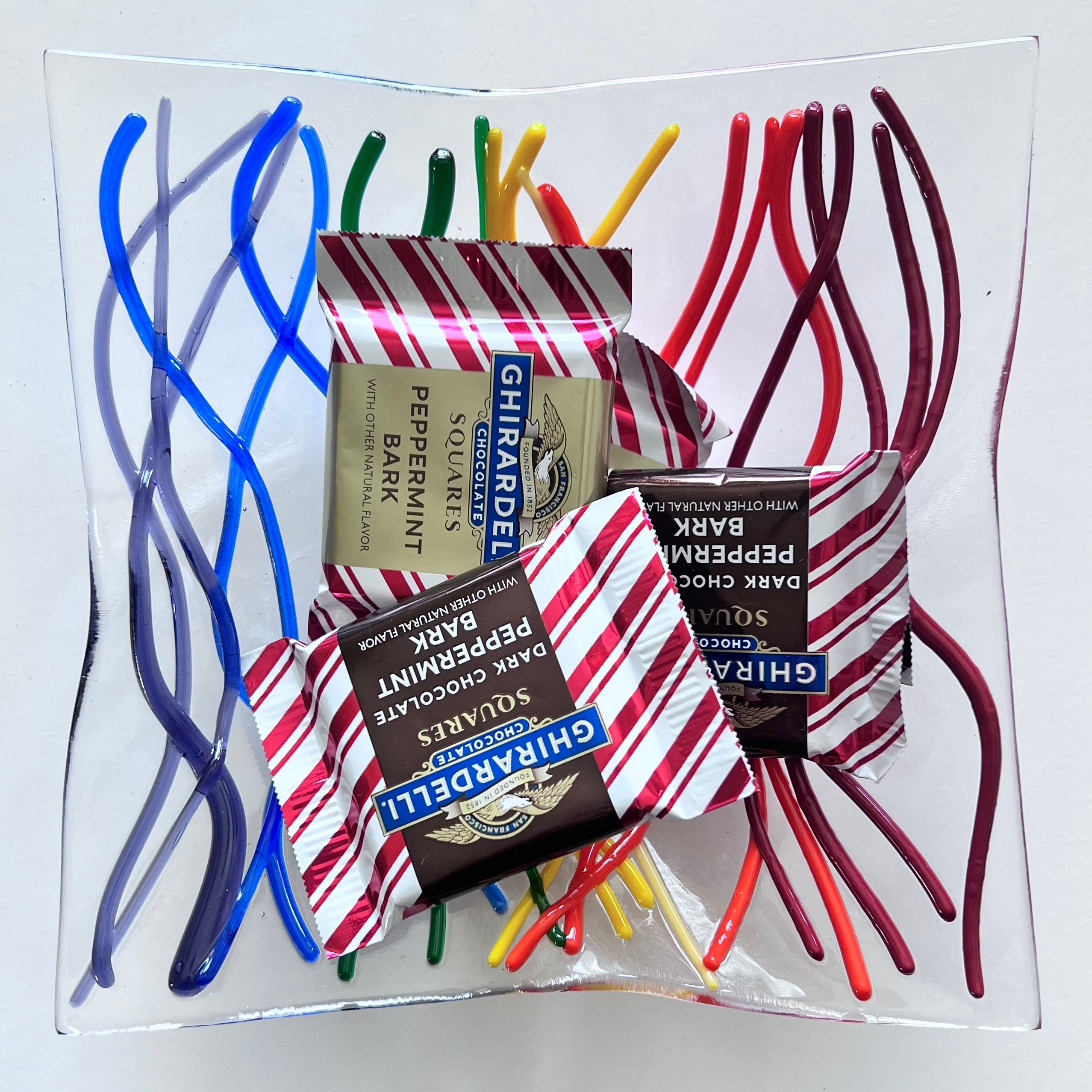 The light sparkles through this handmade 6″ x 6″ dish. Grab this one-of-a-kind art glass dish for your collection. Colorful squiggles of glass are fused to a crystal-clear glass foundation. It was slumped into a lovely fluted shape and can be used in the kitchen, for entertaining, as a perfect gift. Decorative Fused Glass Art Dish. Colorful Art Glass Bowls are a great way to make a statement as you entertain. Your friends will love your style!