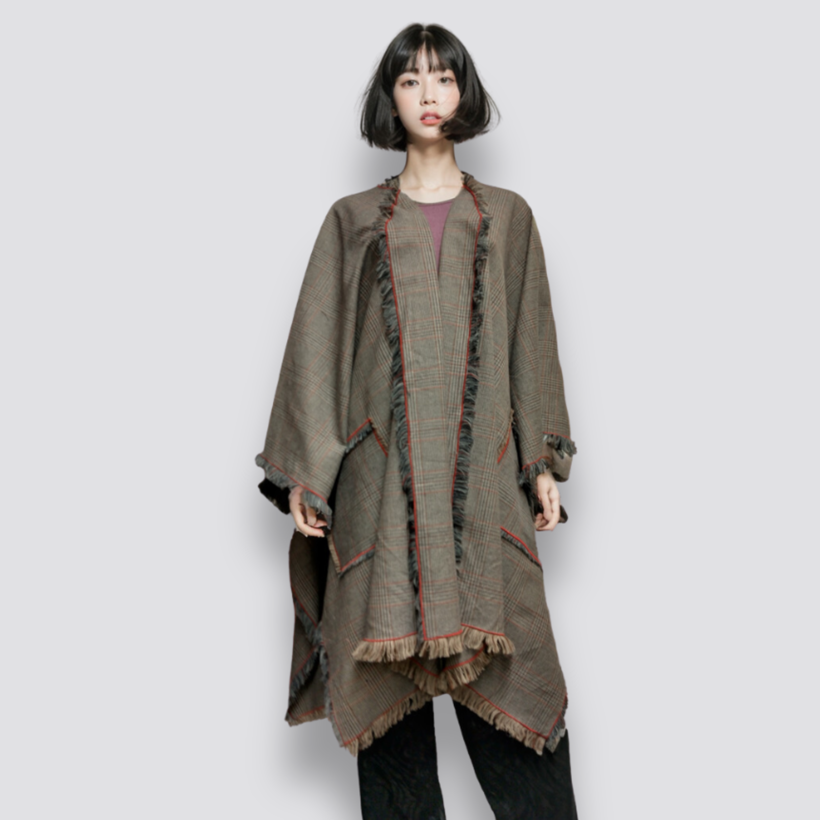 RUANA in Upcycled Grey Plaid Wool with Hand Fringing