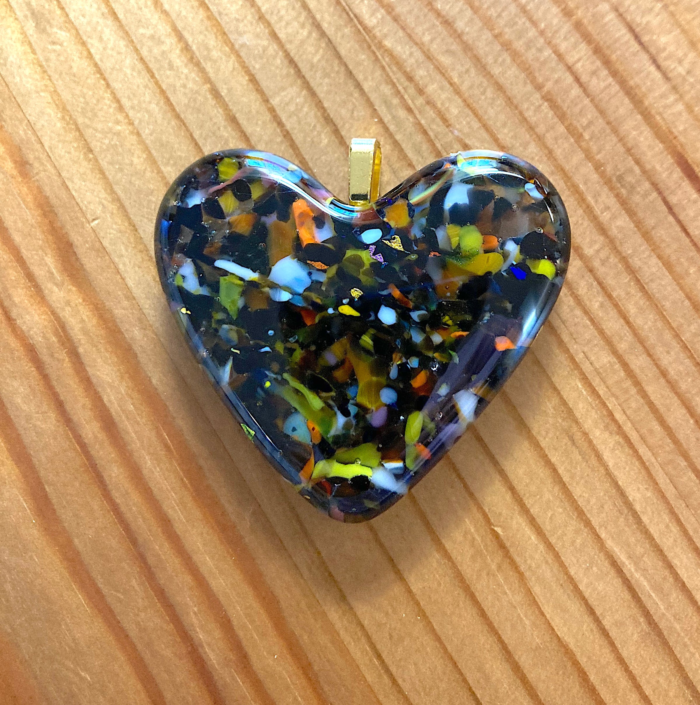 This fused glass heart is crafted from recycled pieces from larger items. The darker multi-colored pieces are accented by clear areas and sparkly bits.