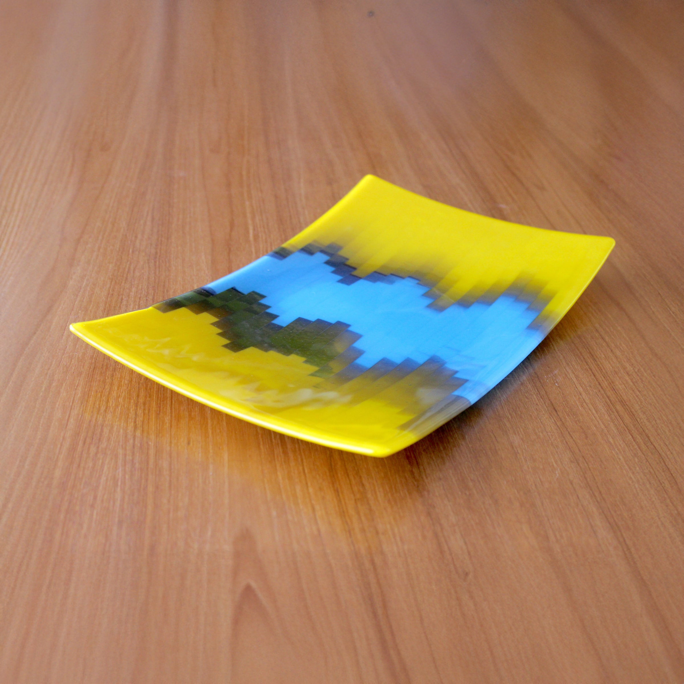 This fused glass platter reminds me of the bright yellow sun shining on a lovely blue sea. Perfect for entertaining and every day use.