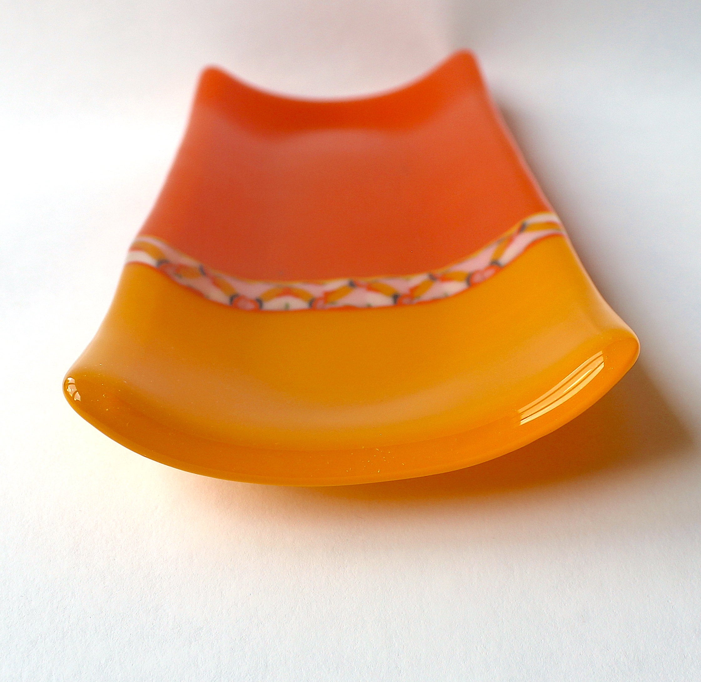 This orange & yellow food-safe fused glass platter sports a patterned stripe of orange, yellow, white & green bits. Some think it looks like sushi log slices or chicks or even candy corn! Whatever it looks like to you, dream up the perfect dish to serve on this cutie.The patterned stripe is made by first fusing pieces of orange, green, white, & yellow glass into a long bar. The bar is then sliced thinly and the pieces arranged for the final fusing. See care & use notes on the Art & Entertaining main page.