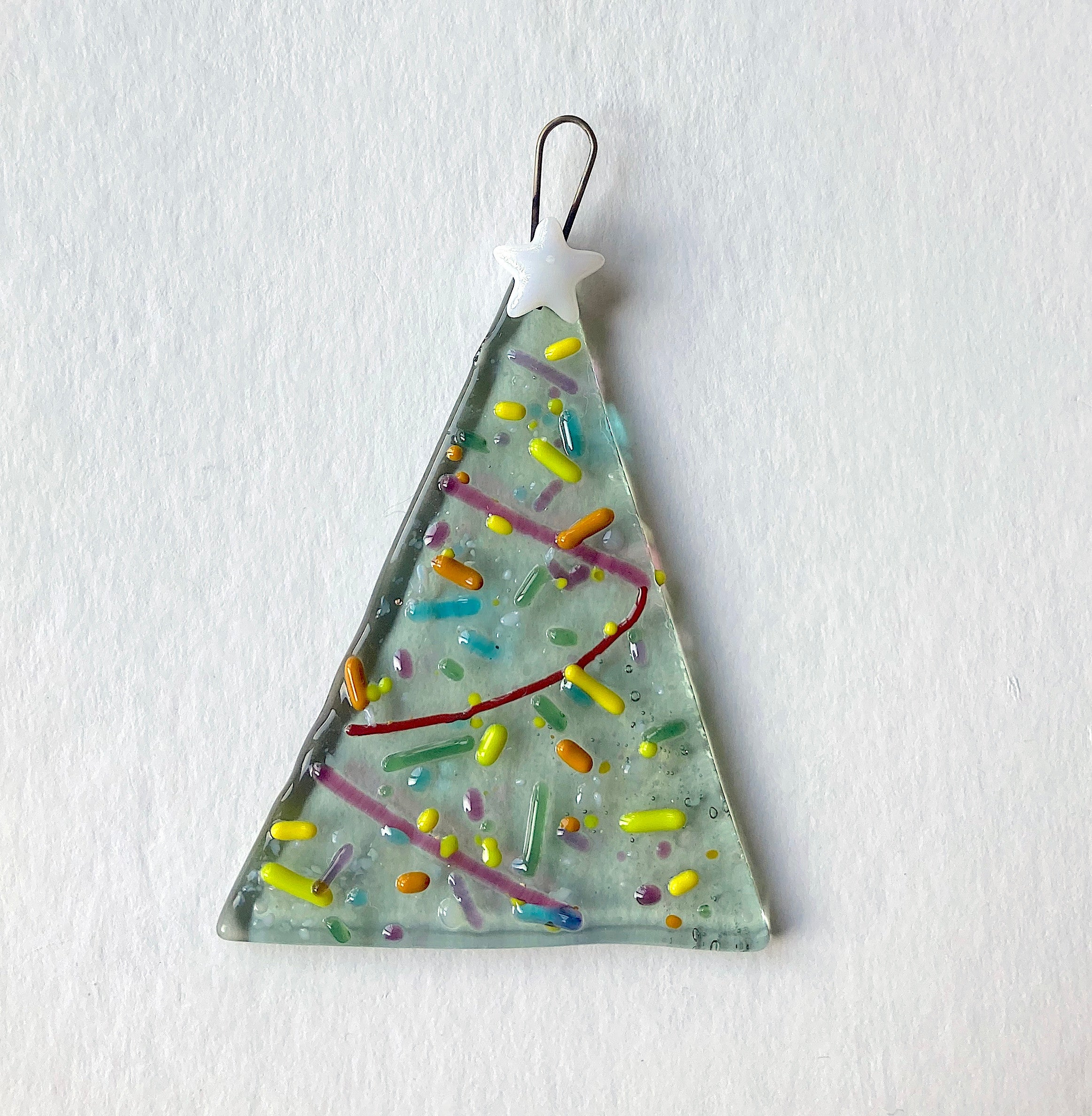 This tree-shaped transparent green fused glass ornament has sprinkles in happy colors to add a smile to the season.