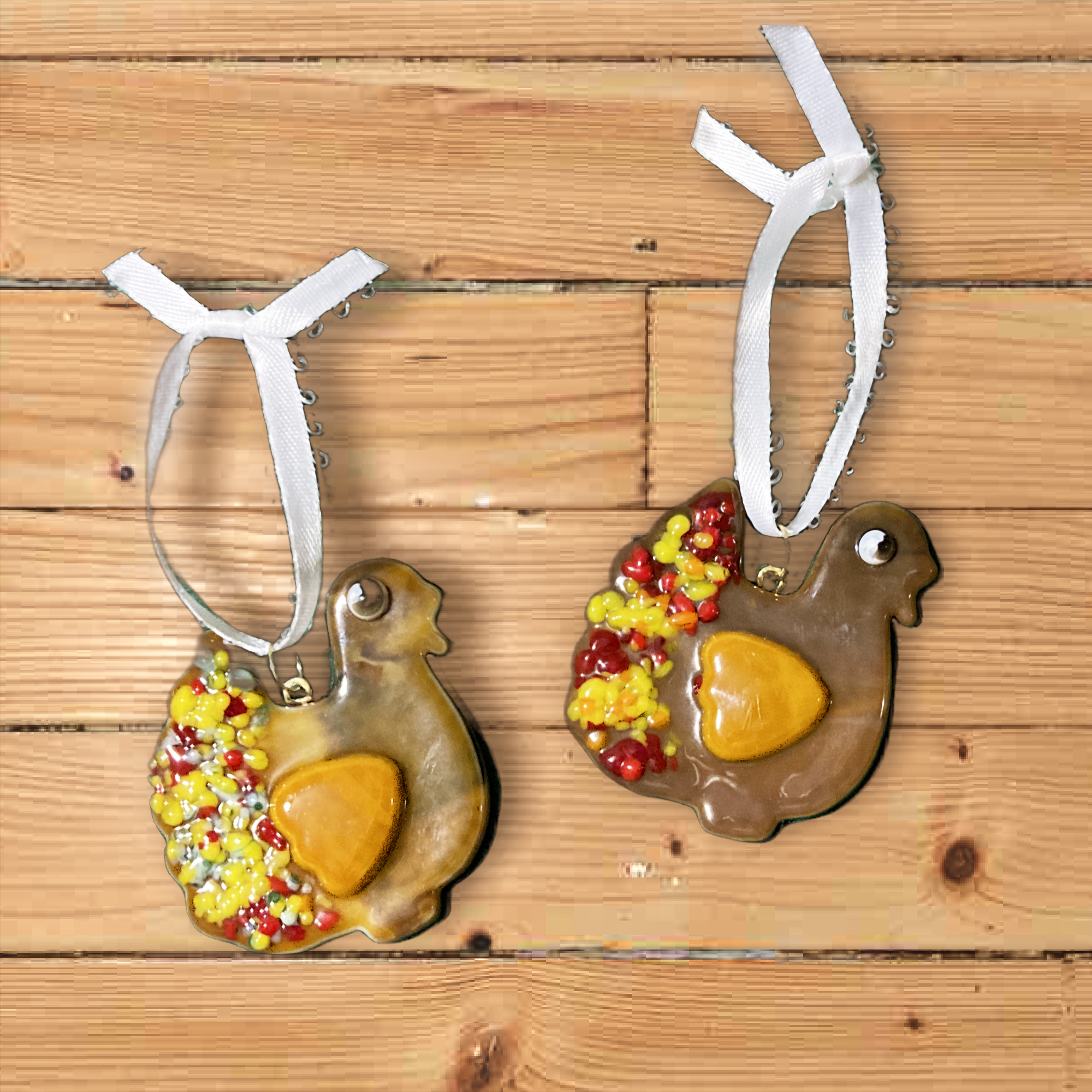 This turkey cutie just the thing to hang around your fall celebrations! Made of fused glass, it can be hung anywhere or add to a necklace or long ribbon and use as a pendant.