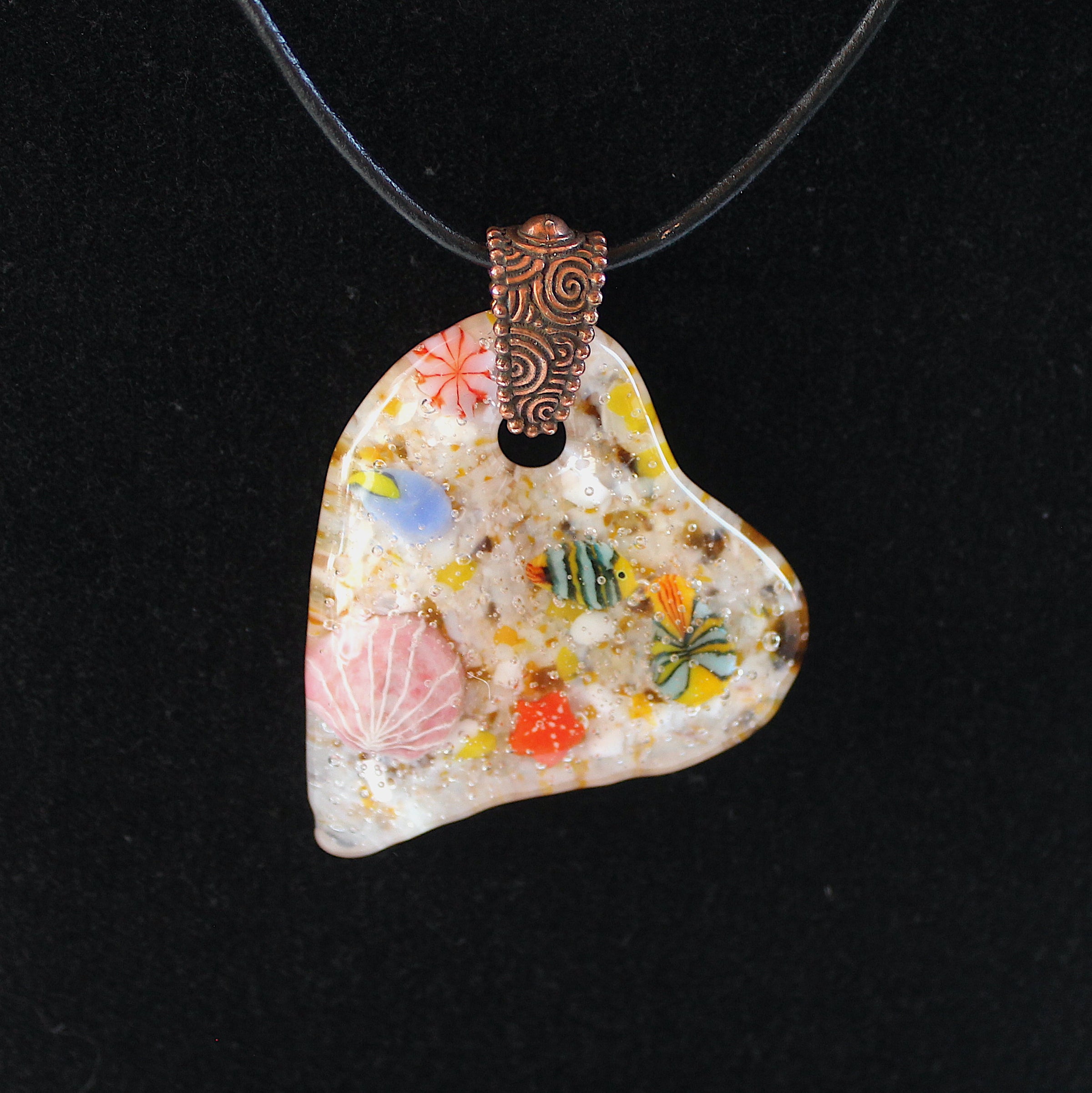 This shells & sea life fused glass heart pendant will give you those beachy fells all year long! Comes with copper bail and 18″ black leather necklace (nickel free clasps). The back is smooth and flat.