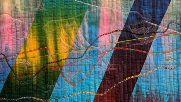 My art quilt uses hand-dyed cotton fabrics. The birds are subtle on the front until you look closely. The background is quilted like a graph; various ribbons and stitches indicate the decrease in birds caused by increase in environmental problems. The back is included in the gallery images, to help you find the birds. A large bird is flying across – its wing positions change. Only a few birds remain on the right.